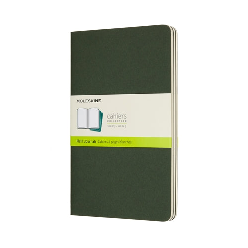The Moleskine Cahiers are journals with a flexible heavy-duty cardboard cover with visible stitching on the spine.