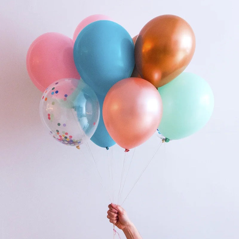 - Set of 12 balloons (not inflated) - Balloons are 11" in diameter - 9 solid color balloons and 3 pre-filled confetti balloons - 100% natural high quality biodegradable latex - Use a hand pump to inflate the balloons - Always throw away deflated or burst balloons immediately - Balloons are made in the USA