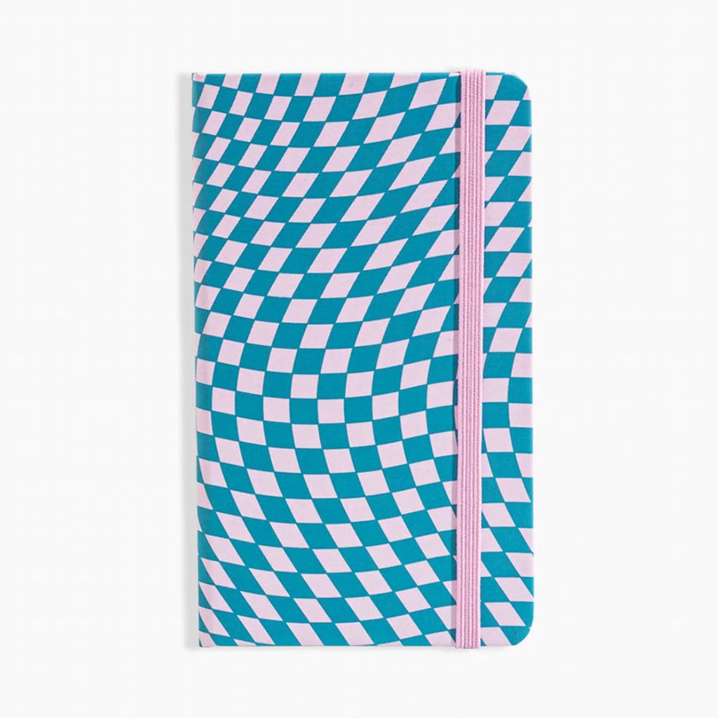 Because you never know when your next great idea will hit you, we designed this handy pocket notebook with an elastic closure to keep it secure. This one comes in a trippy teal and lilac checker design to put a smile on your face every time you use it.