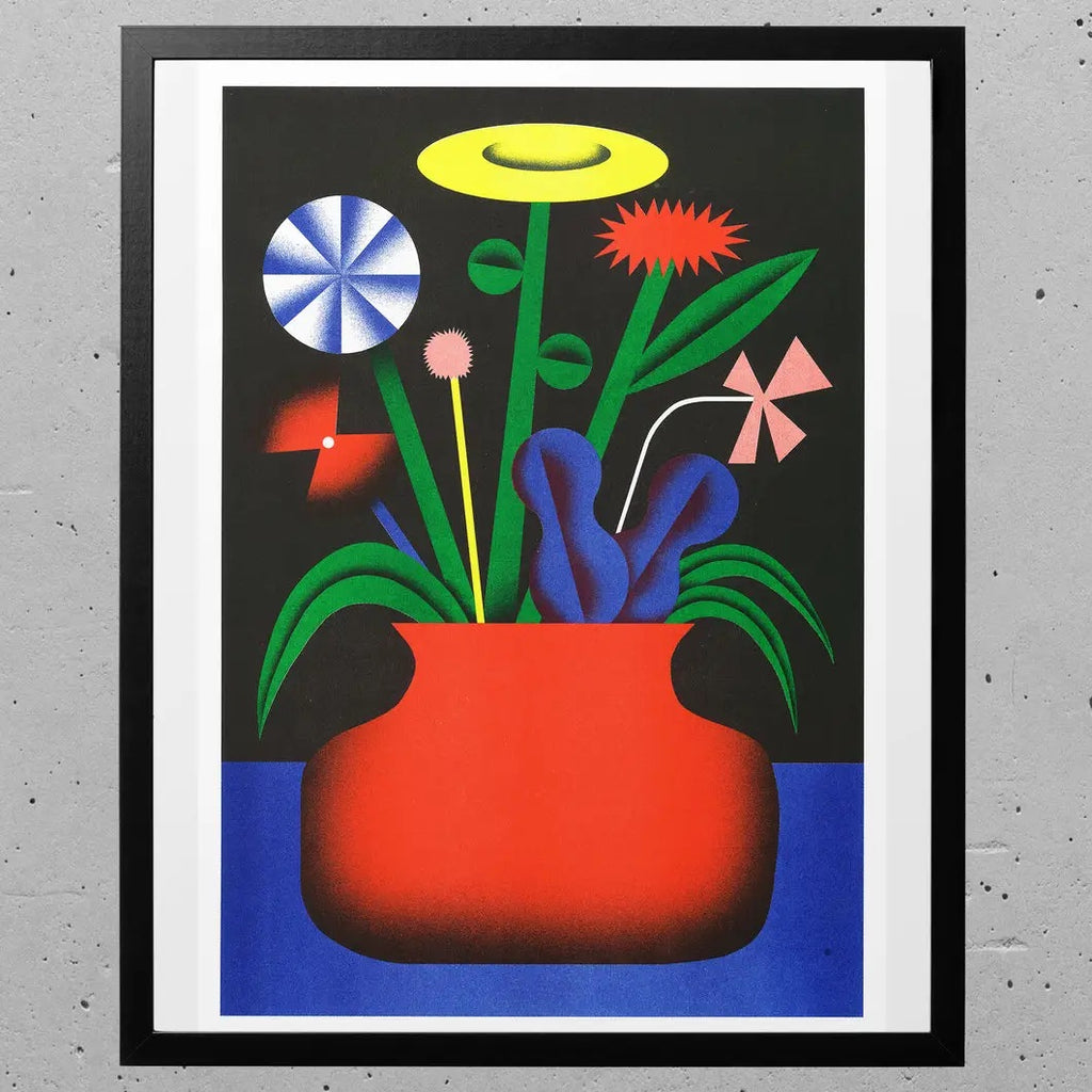 « À deux, c’est mieux » . Voici un adage auquel le duo berlinois ZEBU ne peut qu’adhérer. Non pas qu’on doute de leurs productions personnelles, mais il faut bien avouer que la fusion des skills de Lynn et Denis rend quelque chose d’assez fou. Des illustrations où les couleurs primaires ont élu domicile et où des personnages et motifs aussi étranges qu’imposants viennent nous taper dans l’oeil sans détours. Ultra colorées mais subtiles, les productions de ZEBU sont contre-balancées par un usage du sombre et de la ligne épaisse dont lui seul a le secret. Adepte des grands formats et des peintures sur murs, le duo berlinois fait une petite exception pour la collection ZEBU x Kiblind Atelier et ses 5 posters format A3 imprimés en risographie par nos soins.