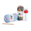 L'atelier de tricotin comporte une notice, deux pelotes de laine et un tricotin en bois en forme de champignon. Présentés dans une jolie boîte en carton illustrée finition mat.