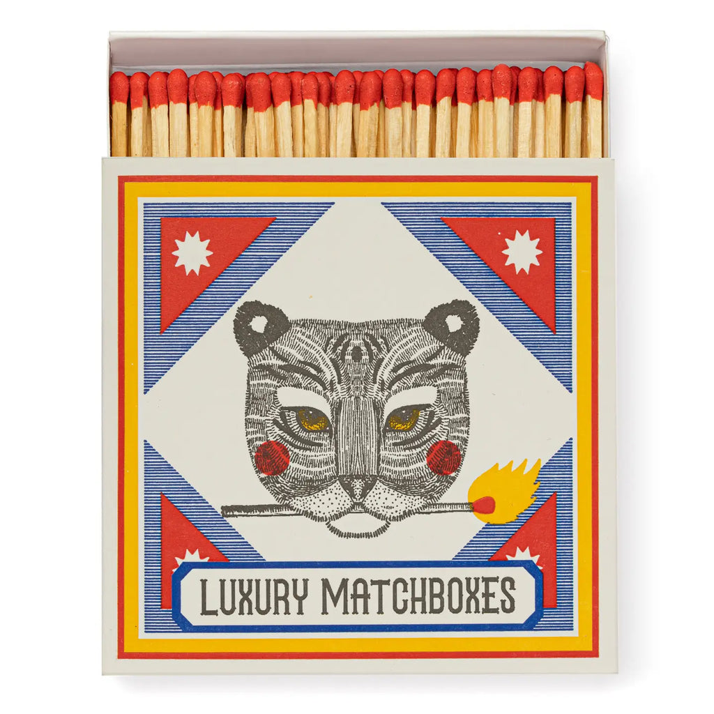Ce tigre, superbement dessiné par Ariane Butto, nous regarde droit dans les yeux, une allumette allumée dans la bouche et un regard de feu dans les yeux. Encadrée dans des teintes primaires saisissantes, cette boîte d'allumettes de luxe ne manquera pas d'apporter une touche de couleur originale à votre espace.