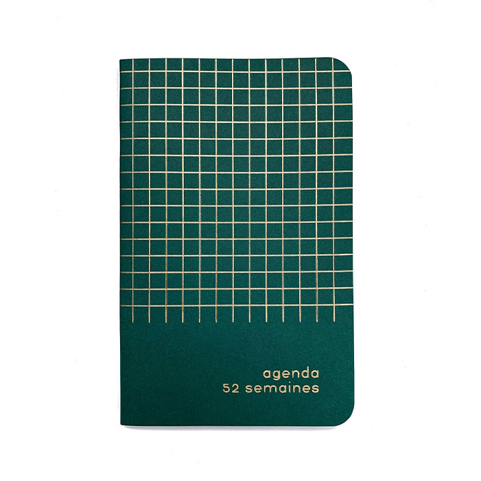 52 semaines Vue complète en page double sur les semaines. Section pour la prise de notes Dimensions : 5,25 x 8,25 po Petite pochette à l'arrière Fait de papier 100% recyclé provenant du Québec.