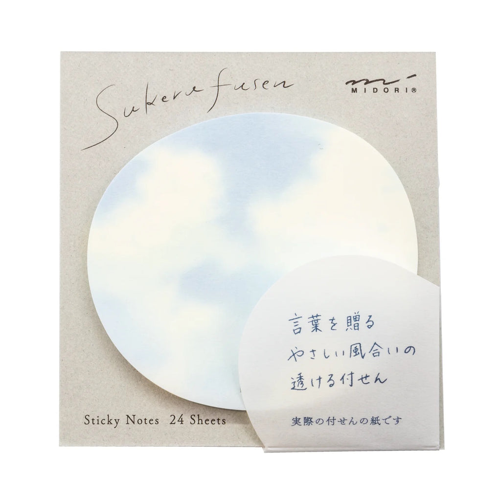 Un ensemble de notes autocollantes rondes, bleues clairs, légèrement transparentes, affichant un design de ciel nuageux.