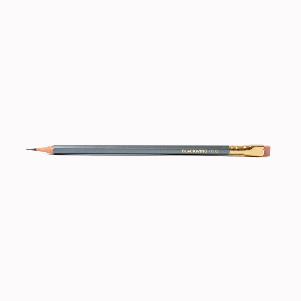 The iconic Blackwing 602 was the pencil of choice for John Steinbeck, Chuck Jones, and countless others before it was discontinued. In 2011, we brought it back. The Blackwing 602 features a firm and smooth graphite core that helps it deliver on its promise of “Half the Pressure, Twice the Speed,” a gunmetal grey finish and iconic square Blackwing ferrule with a pink eraser.